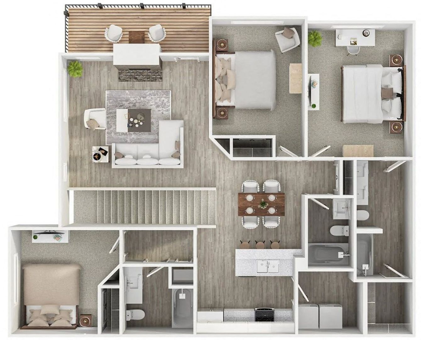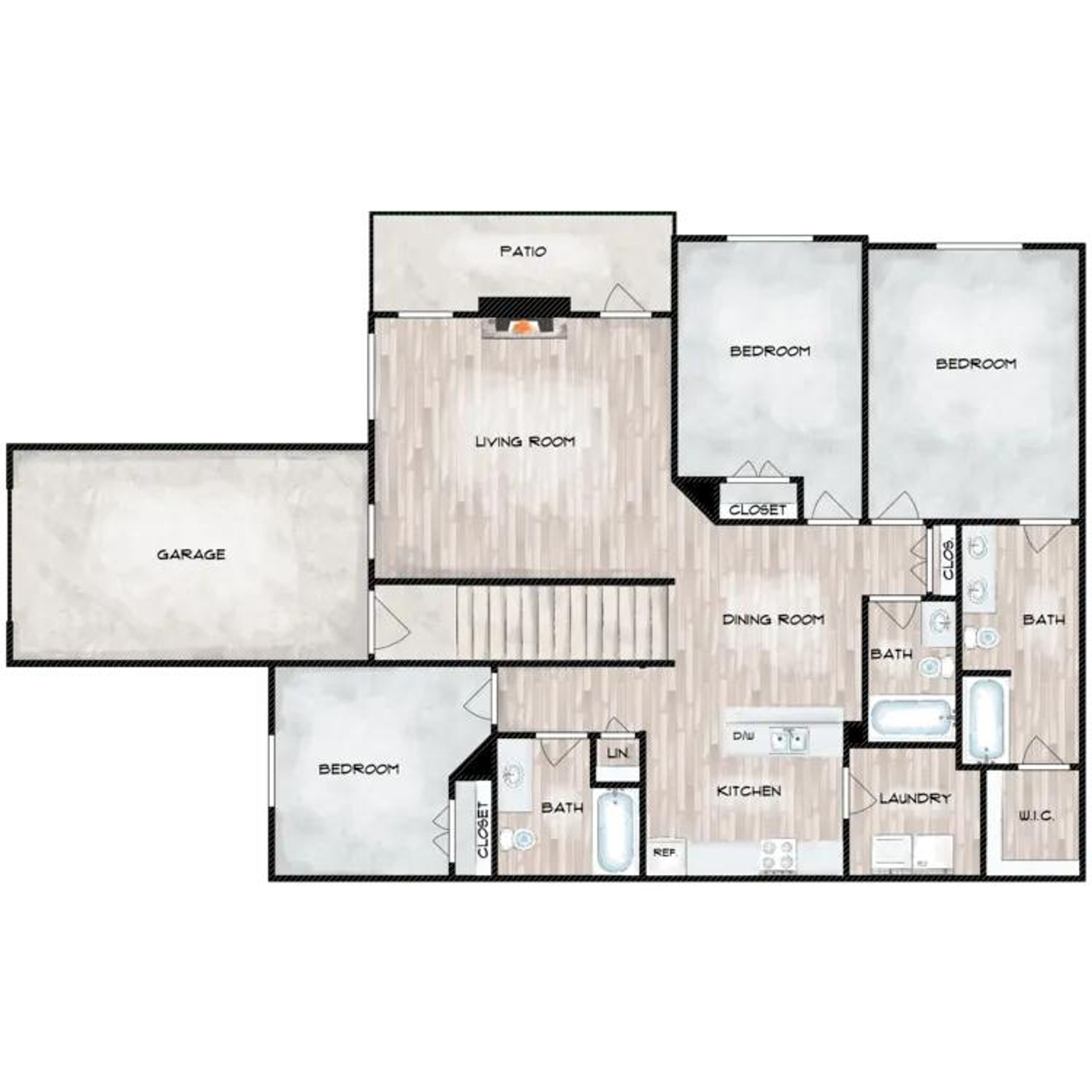 Each pet-friendly home features stainless steel appliances, quartz countertops, full-size washers and dryers, large closets, and private patios or balconies. Select residences also offer vaulted ceilings and private garages, adding extra space and convenience.